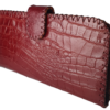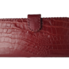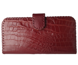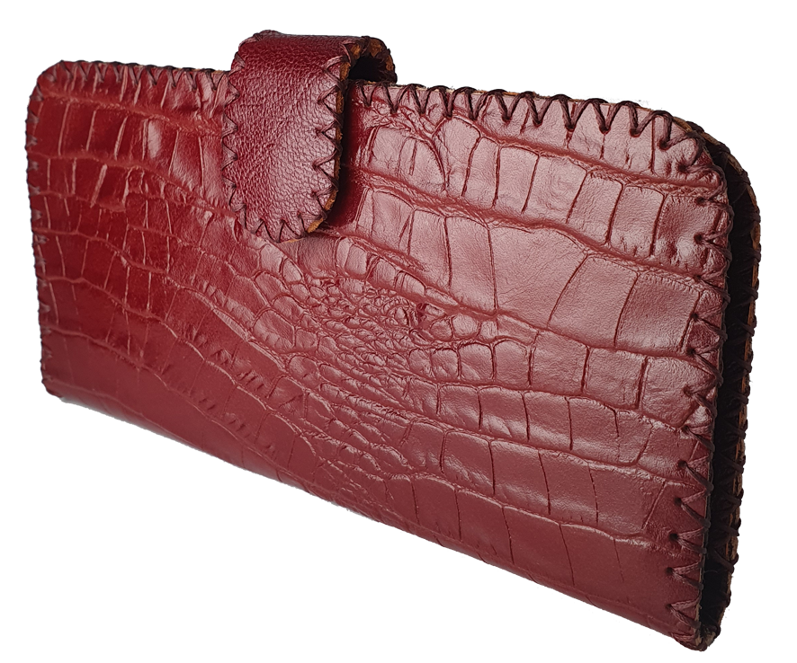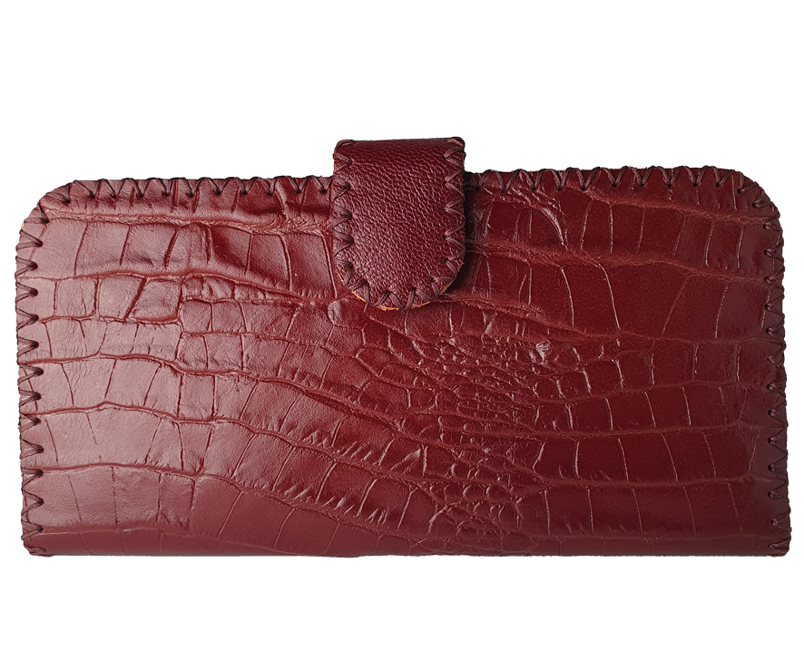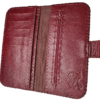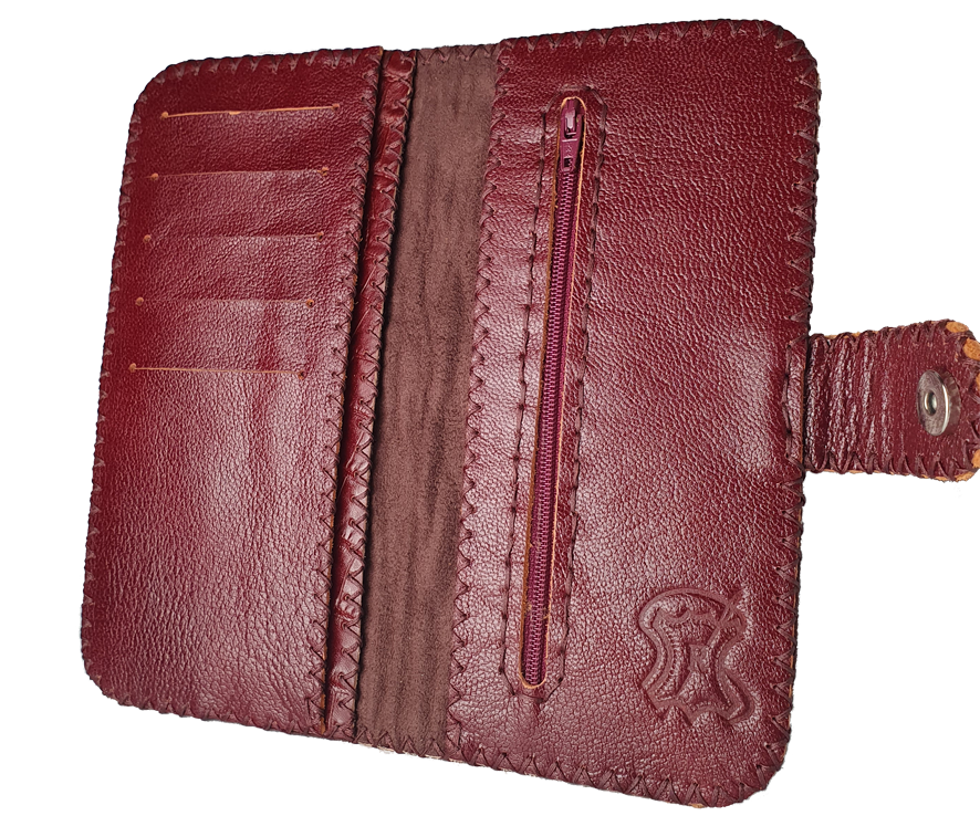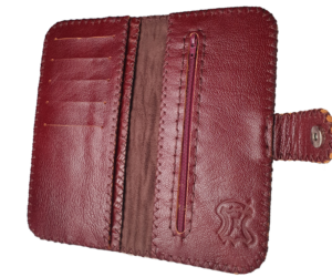 Handcrafted, patterned red leather wallet, with purple string ornementation. Enough space for for up to 5 cards, two spaces to store bills and receipts, one space to hold change.